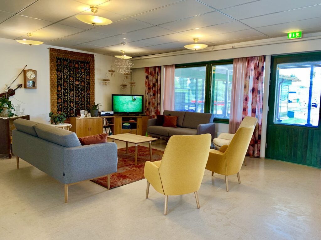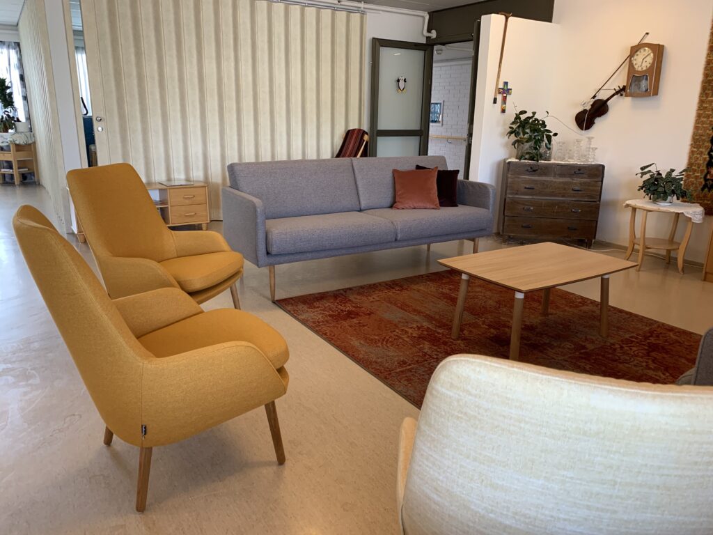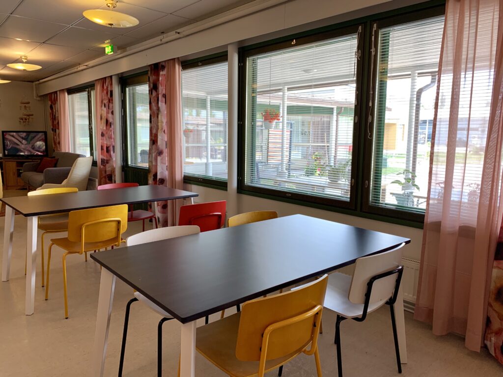 Toiminnassa olevassa mielenterveyskuntoutujien ryhmäkoti Huurmannissa toivottiin uutta, hieman retrohenkistä sisustusta joka istuu heidän tarpeisiinsa entistä paremmin. Suunnittelimme uuden värikkään sisustuksen ruokailutilaan, oleskelutiloihin ja aulaan sekä pitkiin käytäviin asensimme uudet verhot tuomaan hieman näkösuojaa. Sisustusta toteutettaessa otettiin huomioon asukkaiden tarpeet, tilaajan toiveet sekä kodikas lopputulos.