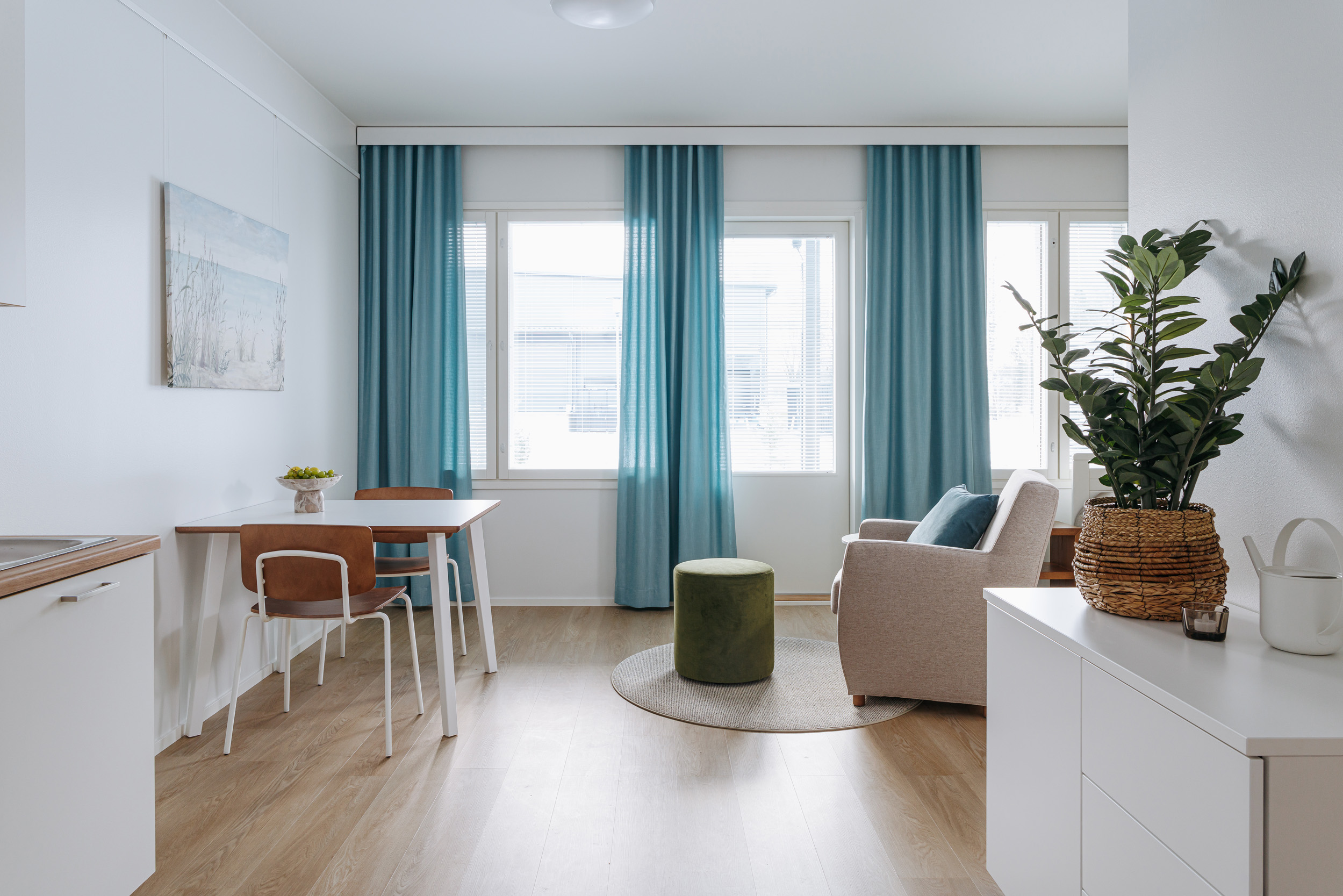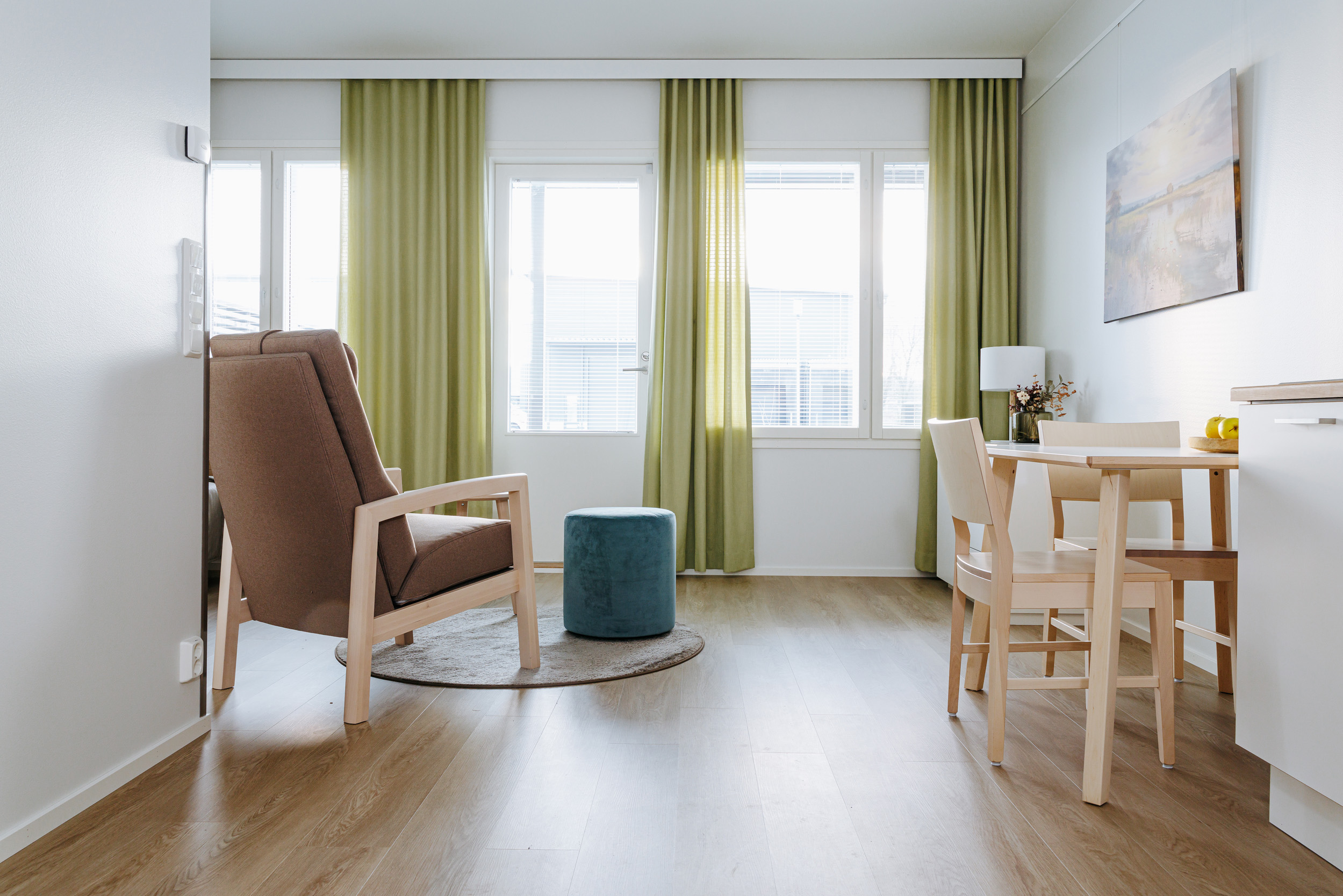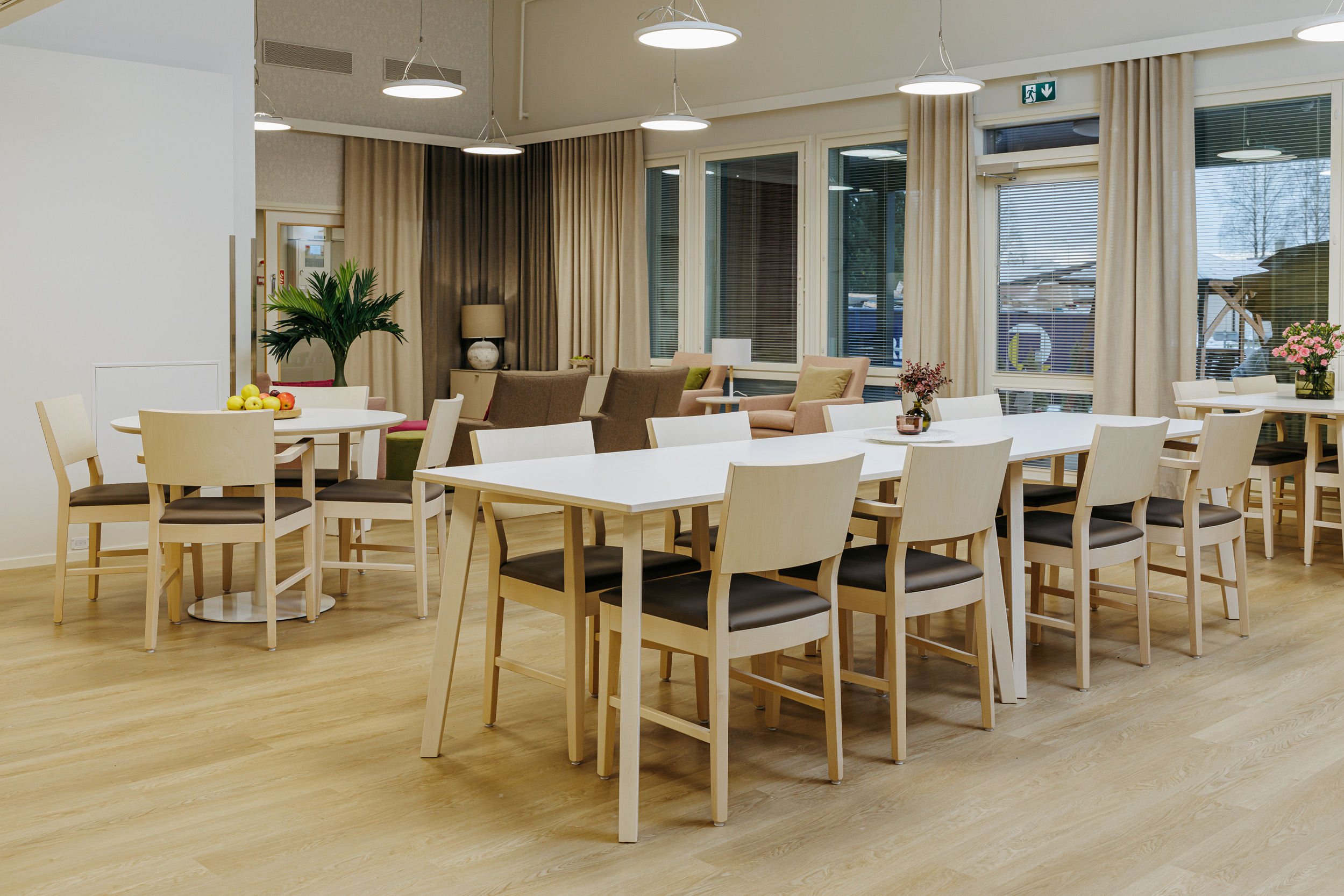Kalustimme kohteen oleskelutilat, ruokailutilan, terassit ja toimistot sekä asukashuoneita. Kalusteiden verhoilukankaat ovat paloturvallisia, vesipestäviä ja kosteussuojattuja. Kalusteita täydentämässä on joukku erilaisia sisustustuotteita ja tekstiilejä, jotka valikoimme kohteeseen sopiviksi.
