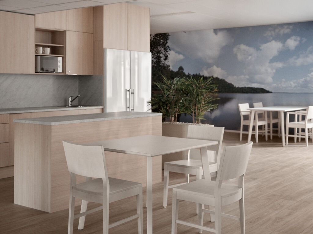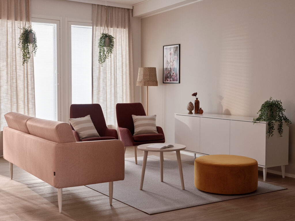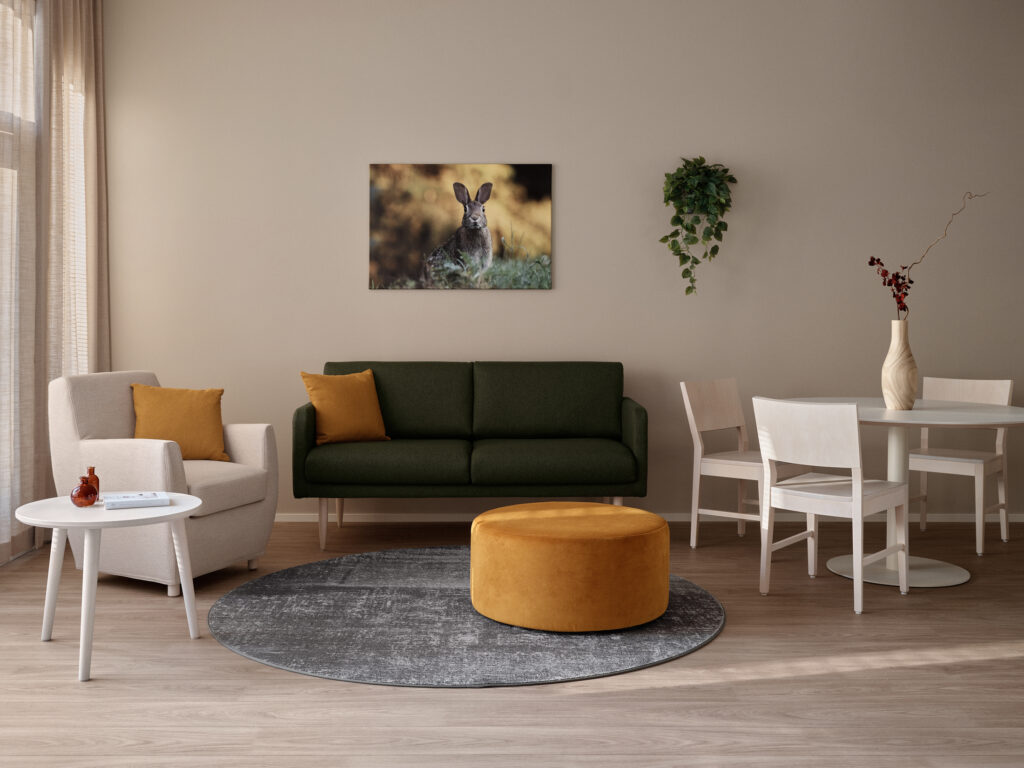 Seinille asennettiin luontoaiheisia canvastauluja ja tilojen viihtyisyyttä lisättiin valaisimilla ja helppohoitoisilla silkkikasveilla. Toimitimme kohteeseen myös paloturvalliset verhot sekä kalustimme kaikki toimistotilat. Kaikissa tuotteissa on kosteussuojattu, paloturvallinen verhoilu ja kalusteiden mitoituksessa on huomioitu palvelukodin vaatimukset niin asukkaiden kuin hoitajienkin osalta.
