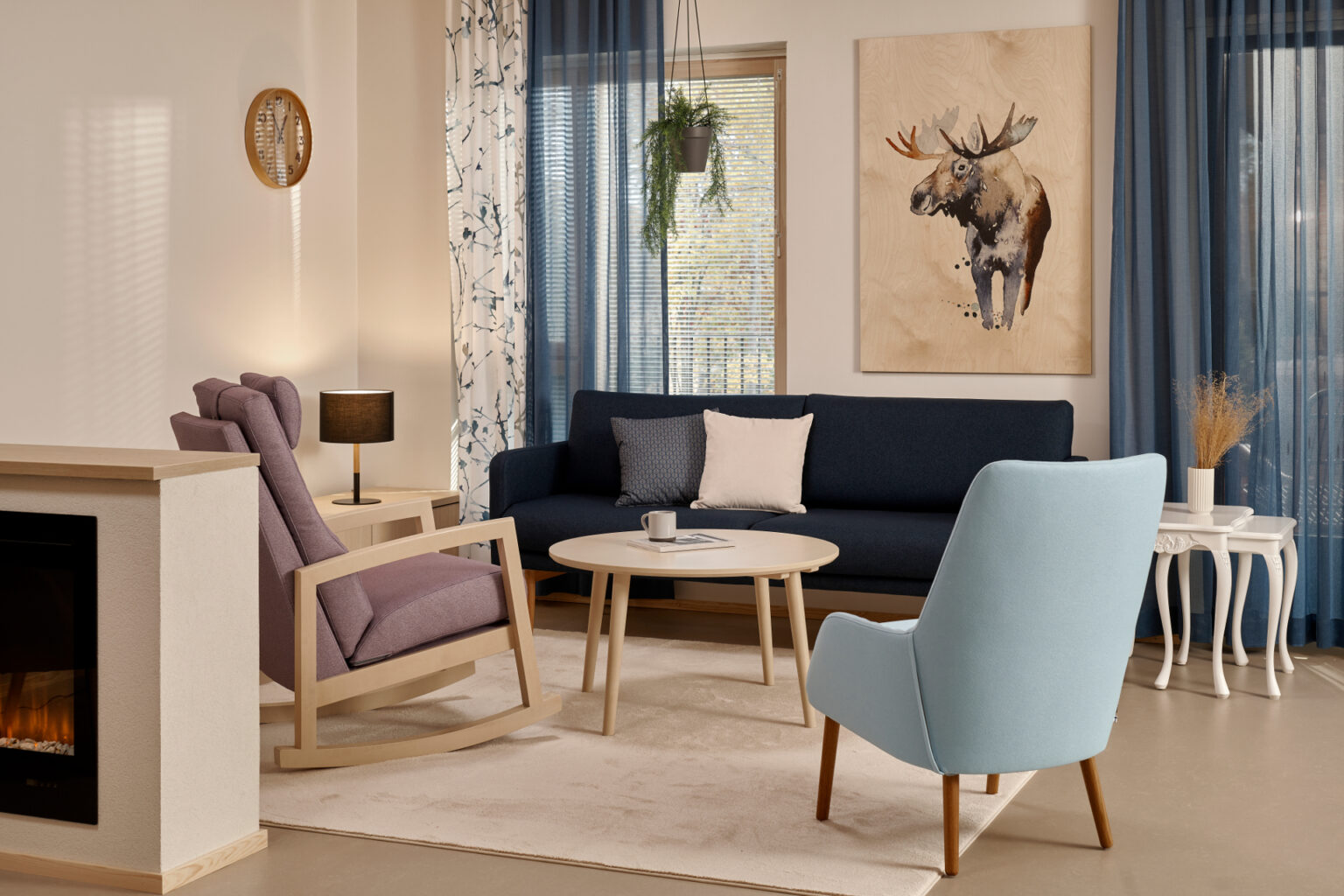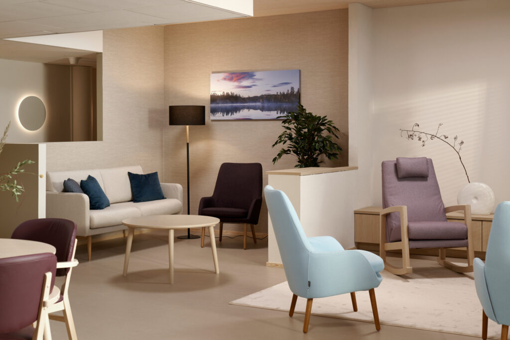 Päiväkummun uusi upea muistisairaiden hoitokoti Helsingin Malminkartanossa valmistui lokakuussa 2021. Suunnittelimme kohteeseen kokonaisvaltaisen ja yhtenäisen sisutuksen asiakkaidemme toiveita kuunnellen. Jokaiseen ryhmäkotiin sekä aulatiloihin pyrimme luomaan kodinomaisen tunnelman yksilöllisin värein.