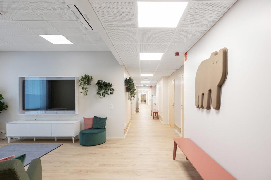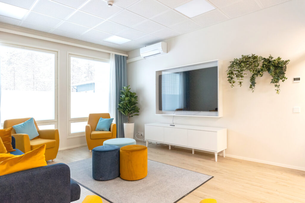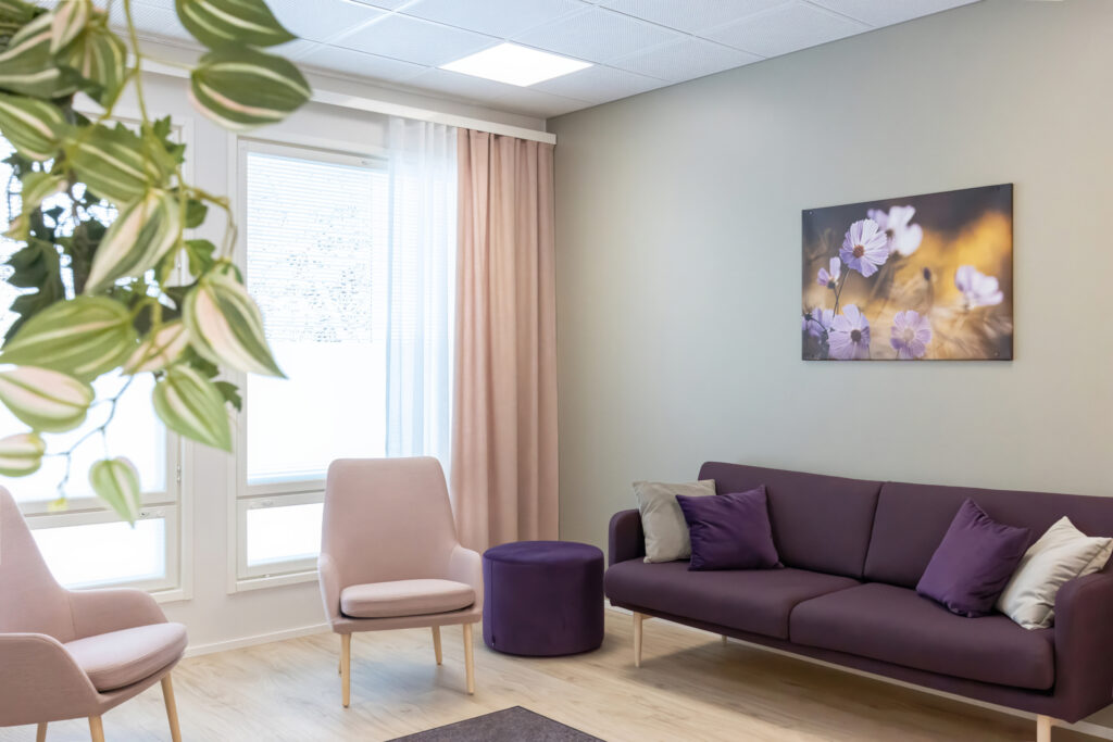 Nokian Harjuniityssä sijaitseva Rinnekoti Tähtisumu kalustettiin marraskuussa 2023. Yksikkö on koti ympärivuorokautista tukea ja hoitoa tarvitseville täysi-ikäisille psyykkisesti oirehtiville kehitysvammaisille ja autisminkirjon henkilöille. Tähtisumussa on kolme ryhmäkotia, joihin kaikkiin suunnittelimme erilaiset värimaailmat ja osin erilaiset kalusteratkaisut riippuen asukkaiden iästä, kunnosta ja toiveista. Yhtenäistä linjaa luotiin kalusteiden muodoilla ja isona pintana näkyvillä verhoilla, joissa on sama verhomalli eri sävyissä kaikissa ryhmäkodeissa. Kaikkien sohvien ja nojatuolien verhoilut ovat irrotettavissa ja kaikki tekstiilit ovat tietenkin paloturvallisia ja vesipestäviä. Erikoistuotteena kohteeseen valmistimme suojakotelot televisioille.