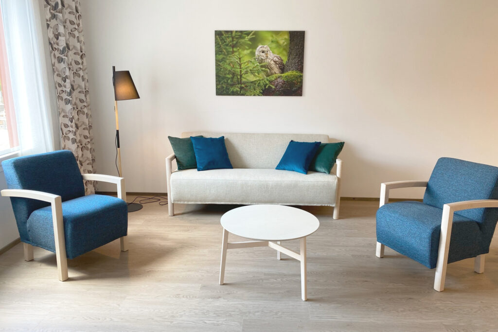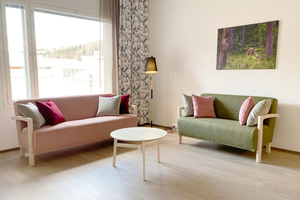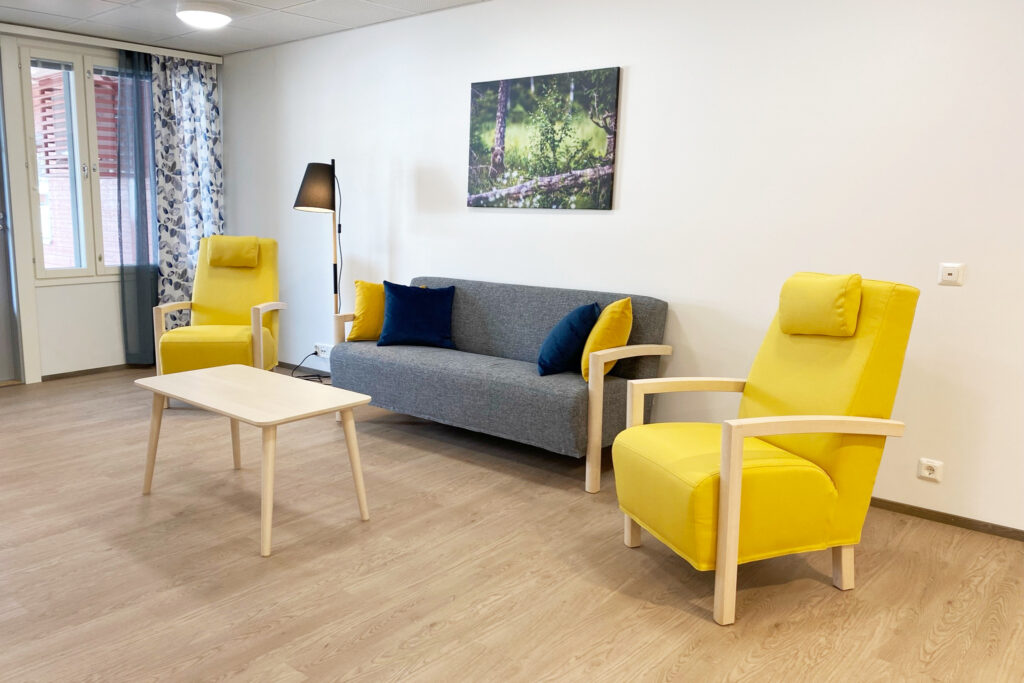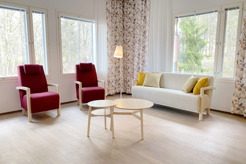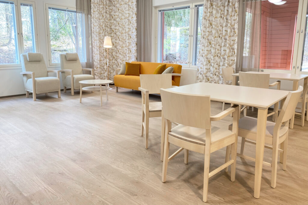 Helsingin Malminkartanossa sijaitseva Rinnekoti Tuulikannel sai uudet tilat kesällä 2022. Yksikkö on koti ympärivuorokautista tukea ja hoitoa tarvitseville kehitysvammaisille ja autismikirjon henkilöille. Tuulikanteleessa on kuusi ryhmäkotia, joihin kaikkiin suunnittelimme erilaiset värimaailmat ja osin erilaiset kalusteratkaisut riippuen asukkaiden iästä, kunnosta ja toiveista. Yhtenäistä linjaa luotiin kalusteiden muodoilla ja isona pintana näkyvillä verhoilla, joissa on sama printti eri sävyissä kaikissa ryhmäkodeissa. Kaikkien sohvien ja nojatuolien verhoilut ovat irrotettavissa ja kaikki tekstiilit ovat tietenkin paloturvallisia ja vesipestäviä.