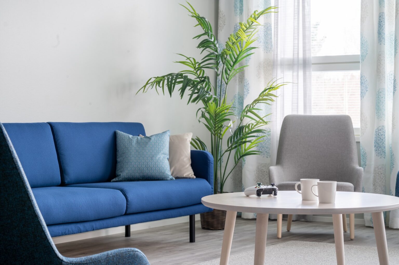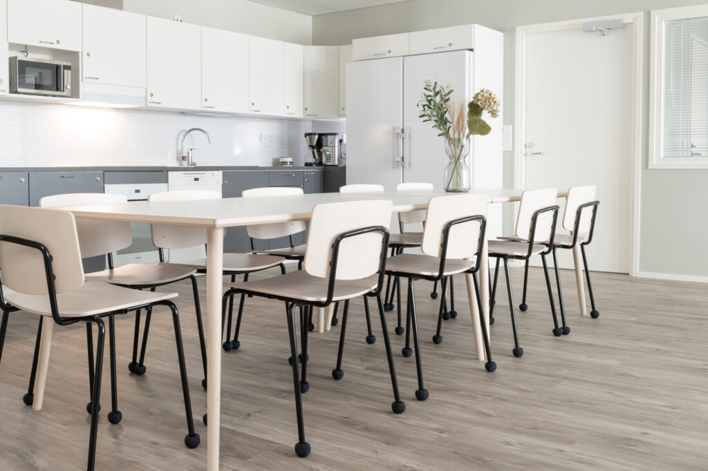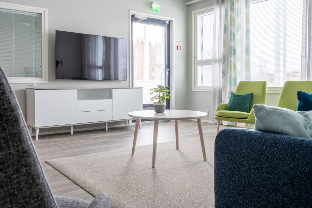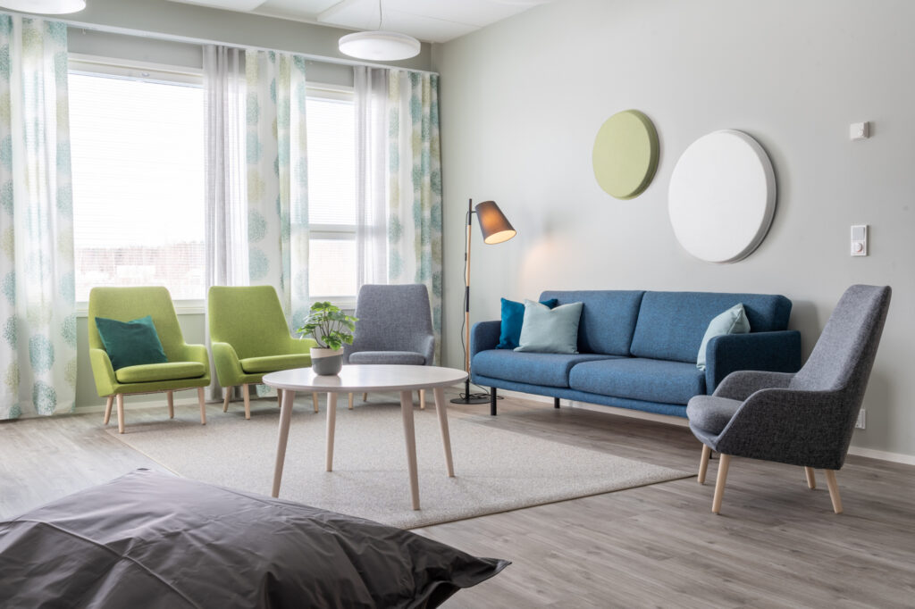 Maaliskuussa 2023 kalustettiin uusi lastenkoti Iisalmeen. Asiakkaan toiveena oli viihtyisten tilojen lisäksi helppohoitoiset materiaalit, tummat sävyt sekä kohtuullinen hintataso. Tavoitteisiin päästiin valikoimalla eduliset, mutta kestävät kankaat pehmeisiin kalusteisiin sekä valitsemalla oikean käytötason kovia kalusteita oleskelu- ja ruokailutiloihin sekä asukashuoneisiin.